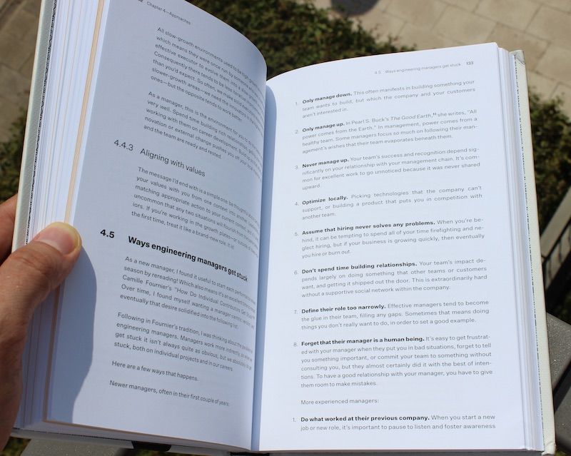 The tone of the book is casual: it feels like we're sitting with Will, having coffee, while he talks about problems he's faced at different companies, systemic approaches he's seen work best, then giving examples of things that worked for him, in the past. I like how the book rarely presents "best" approaches, instead, Will shares what worked for him - with a healthy dose of systems thinking - and approaches he recommends to his peers and managers on his team.