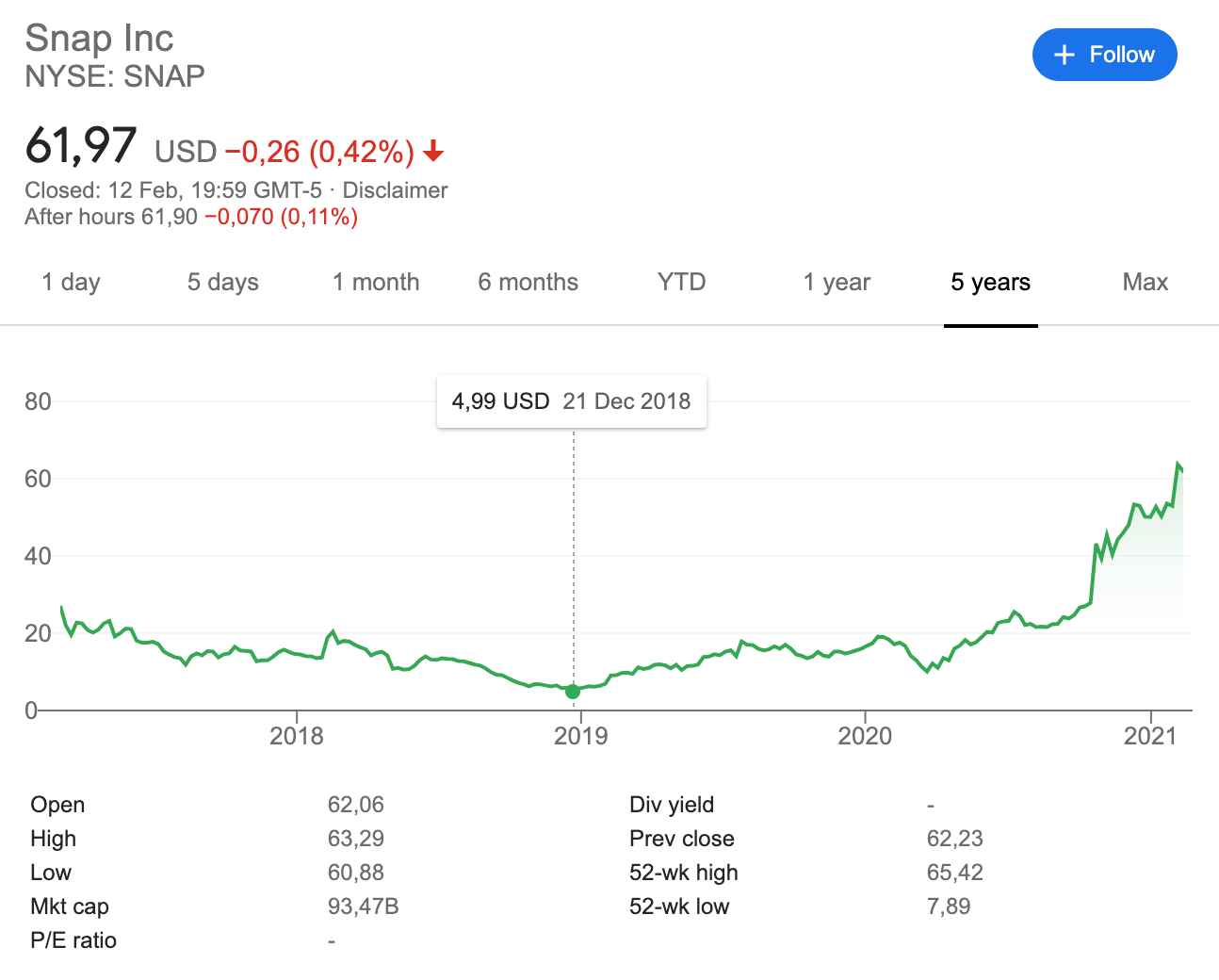 - €500K/year at Snap, in Europe for a senior engineer, thanks to stock rises. A person I know received an offer at Snap with €100K/year in base salary and $100K/year in RSUs. They received RSUs around $10 each in early 2019 - a total of around 30,000 RSUs. The stock has grown by more than 6x, and this person is currently vesting around €400K/year just in stock. Had they not received such a strong equity package, they would not have benefitted from the rise in equity.