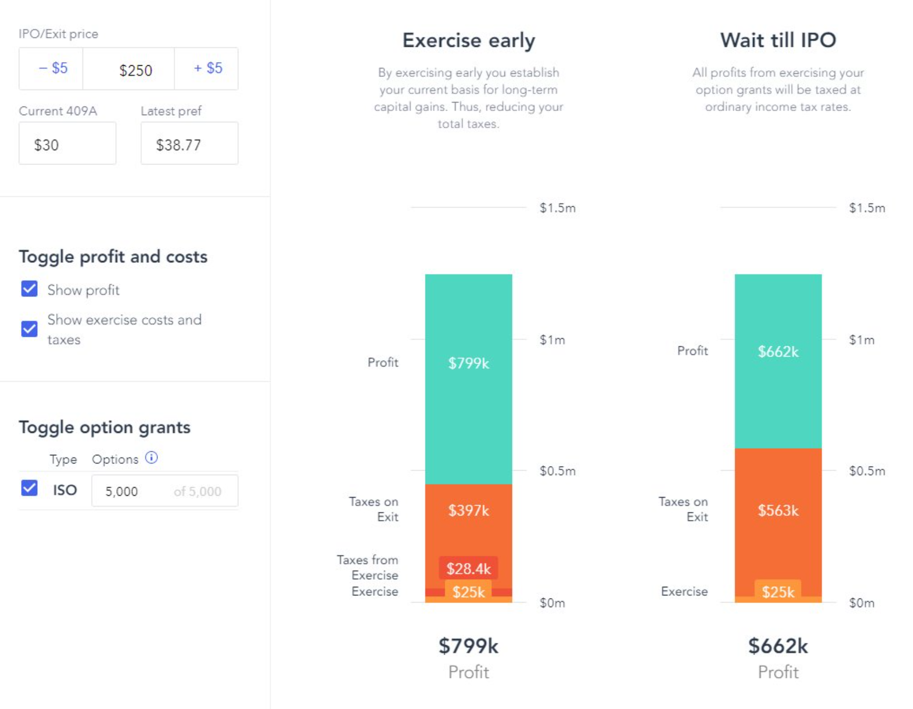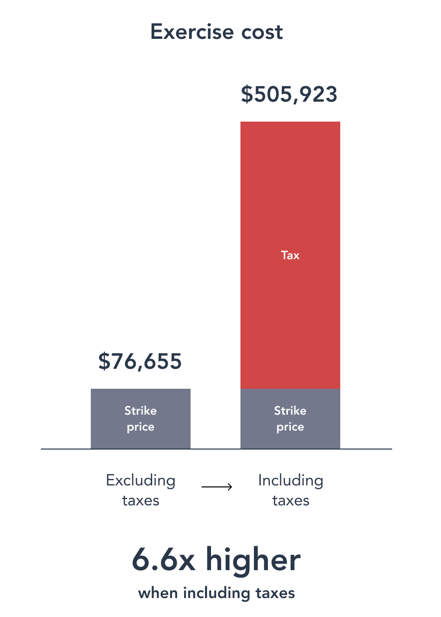Taxes on top of exercising options are often a huge surprise factor, especially for late-stage unicorn employees. Secfi collected data from individuals in more than 700 late-stage unicorn companies in the US and found taxes to account for more than 6x the exercise price in this study: