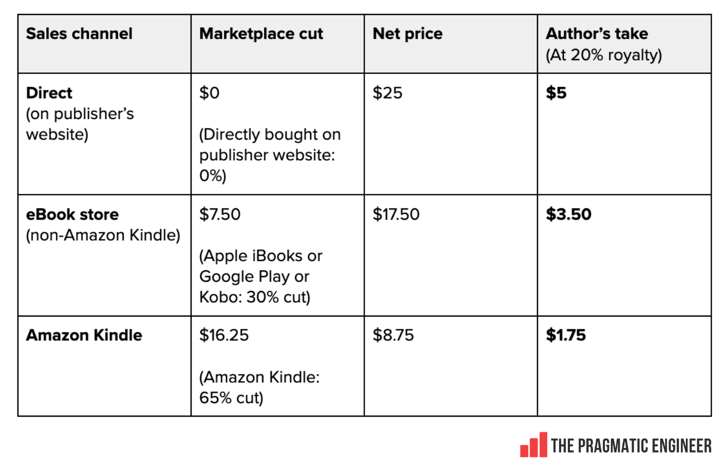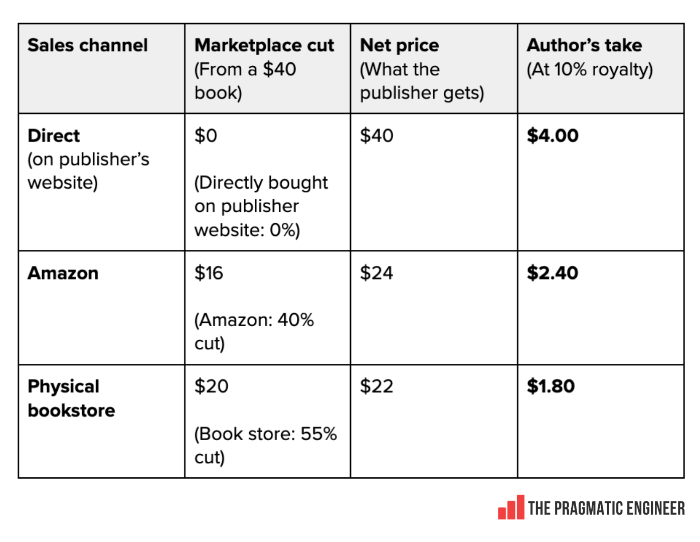 It matters financially where your title is purchased; be it an online shop, physical book store, or purchased directly from the publisher. Many tech books are sold on Amazon and online stores. Amazon’s 40% cut seems high, but it’s actually the lowest among book retailers. Up to 60% is a common cut for a physical bookshop.