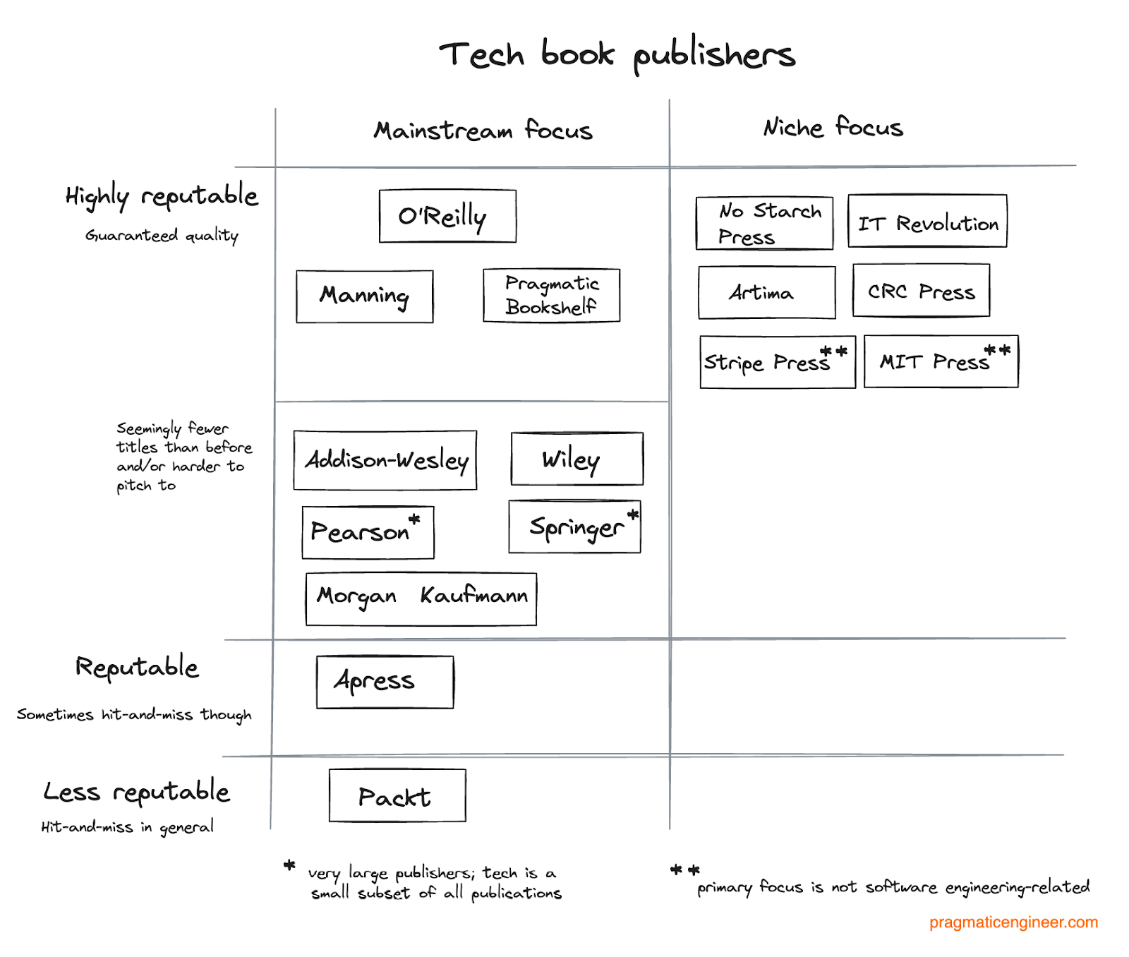 Today, there are reputable book publishers whose titles are good and authoritative, and there are other publishers whom this doesn’t apply to. Each publisher also has a subject area: some are mainstream and publish titles about every software engineering area from languages to engineering management. Meanwhile, others stick to a topic of expertise they focus on.