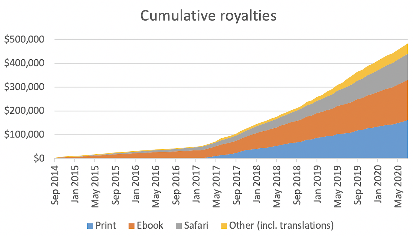 Designing Data Intensive Applications author, Martin Kleppmann, shared the cumulative royalties he made in 6 years. The breakdown is interesting; ebook and Safari Online sales generated more revenue for the writer than the print version.